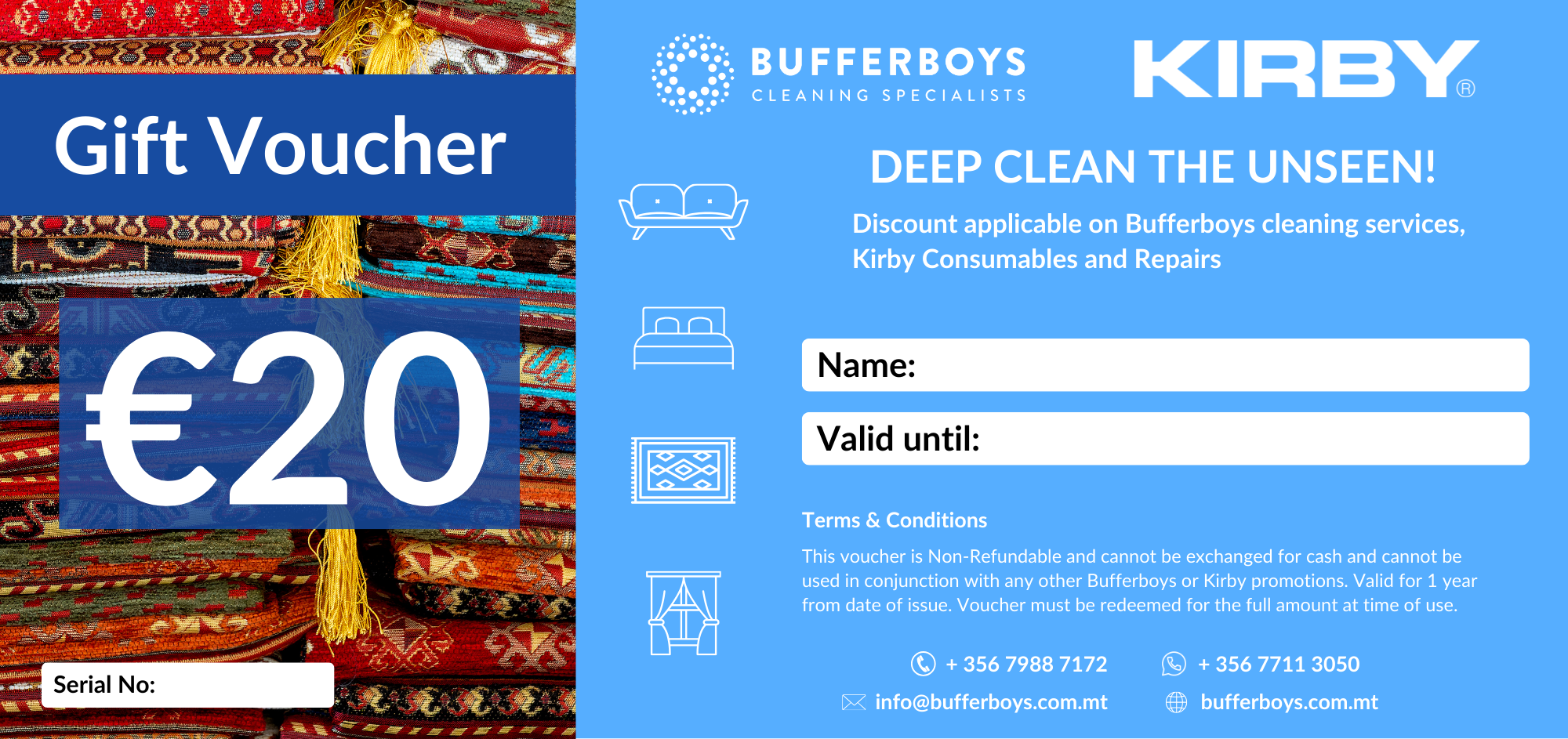 This voucher is Non-Refundable and cannot be exchanged for cash and cannot be used in conjunction with any other Bufferboys or Kirby promotions. Valid for 1 year from date of issue. Voucher must be redeemed for the full amount at time of use.